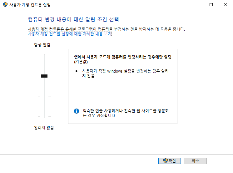 만일 모든 프로그램에 대해서 사용자 계정 컨트롤 팝업창이 뜨지 않도록 하고싶다면..