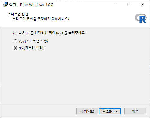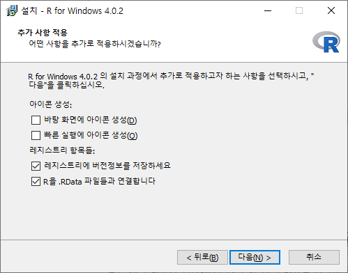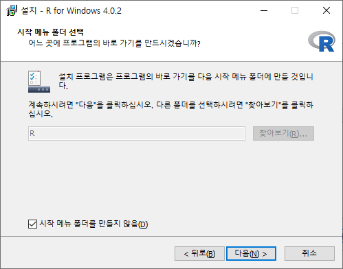 보통은 시작 메뉴 폴더를 만들어 편하게 R프로그램에 접근한다. 그러니 일반적으로는 저 체크박스에 체크를 하지 말자.