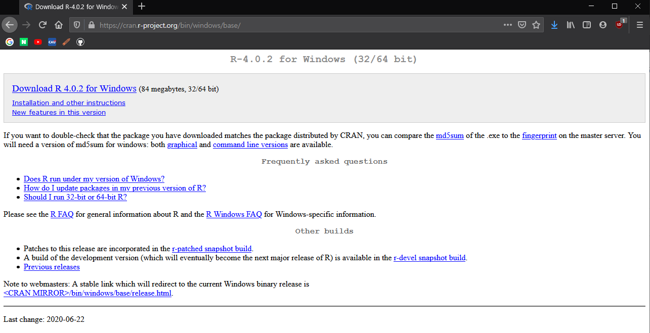 2020년 8월 21일 기준으로 R 4.0.2 버전이 최신 버전이다.