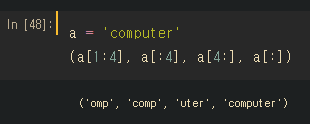 즉, a[1:3]은 인덱스 1부터 인덱스 3의 앞 문자까, 또다른 말로 하면 두번째부터 세번째 문자를 잘라서 출력하는 것이다.