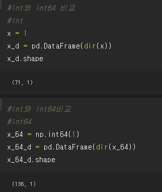 Python의 기본 자료형인 int형과 Numpy의 자료형인 int64는 사용할 수 있는 연산자, methods와 attributes에 큰 차이가 있다고 한다.