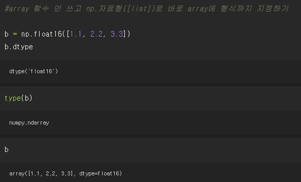 #array 함수 안 쓰고 np.자료형([list])로 바로 array에 형식까지 지정하기