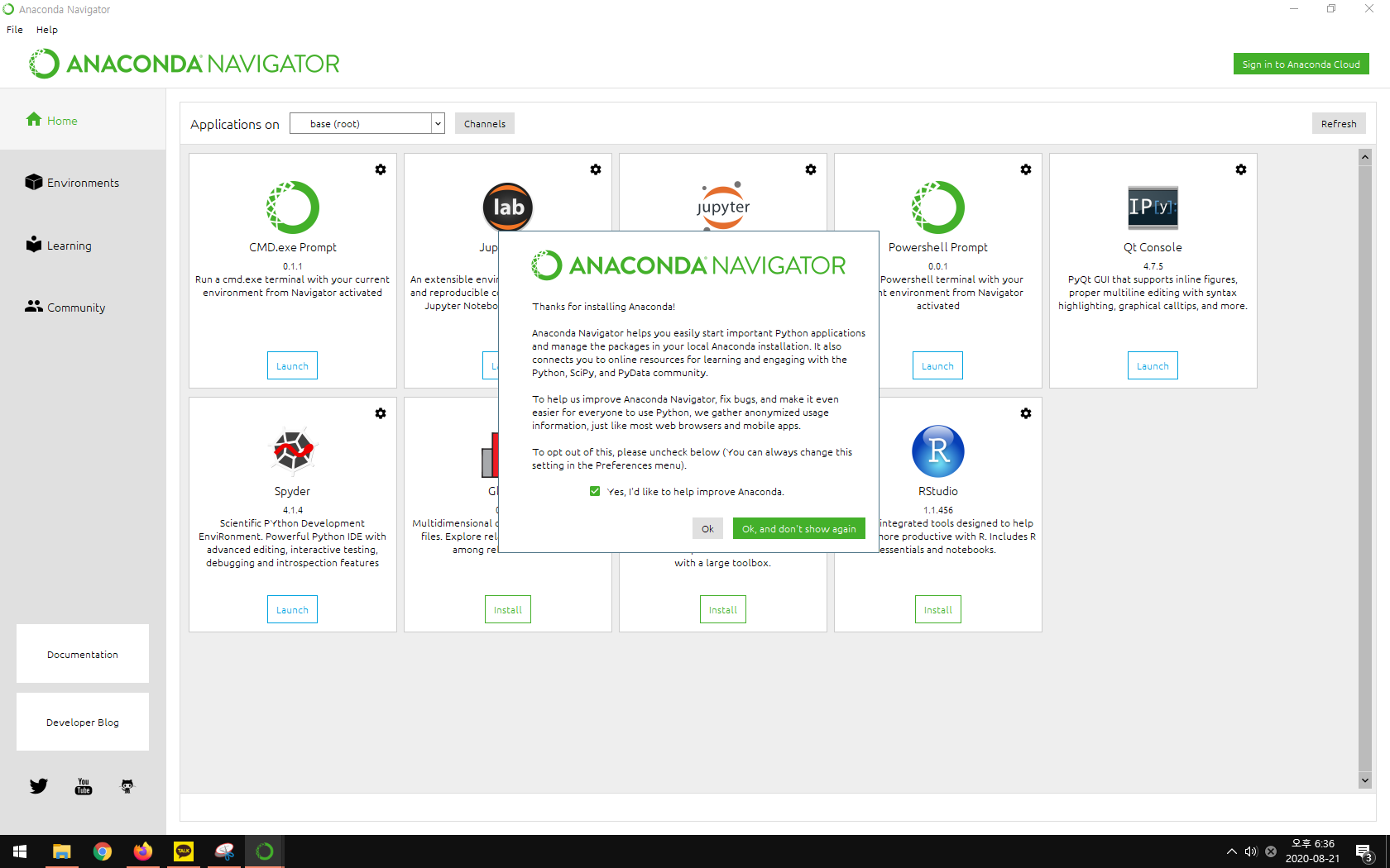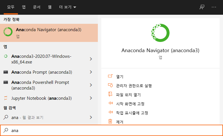 설치된 파일중 anaconda navigator을 실행해봅시다.